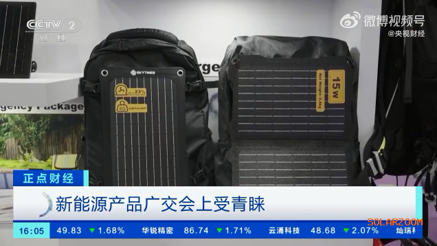 第134届广交会正在进行中。开展第一天,来自全球200多个国家和地区超过5万名境外采购商到会,同比上届大幅增长。采购商积极找寻所需产品,参展商各出奇招“抢订单”。本届广交会上,包括电动载人汽车、太阳能电池、锂电池在内的“新三样”产品受到采购商的青睐,新能源展区的规模增幅达172%,成为本届广交会最大的亮点。在新能源展区,一个带有太阳能板的背包吸引了记者的注意,重量只有0.4千克,也就是两个手机的重量。在户外找不到电源时,“随身充电”书包2个小时就可以把手机充满。