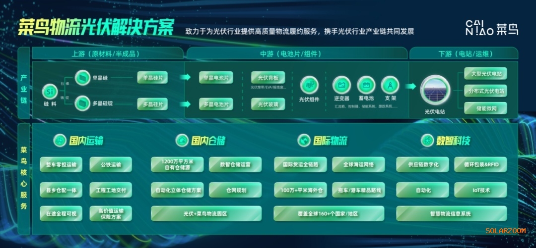 菜鸟正大力拓展新能源光伏市场,服务对象包括通威、晶澳、一道新能源、阿特斯、东方日升、中节能、阳光能源、高景太阳能等众多厂商。除了传统的B2B干线运输之外,菜鸟也正在将仓储、循环包装、数字化、自动化、光伏0碳园区建设等能力带入光伏行业,服务光伏行业全产业链发展。