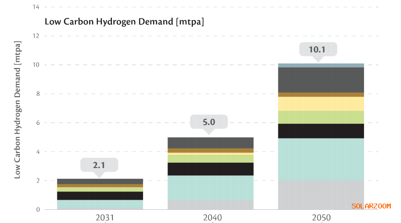 该战略预测,2031年至2050年间,阿联酋国内市场对氢能需求可能增长5倍,即从210万吨/年增长到1010万吨/年。同时,出口量可能达到480万~960万吨/年。初期出口的产品主要是氢气衍生品和绿色产品,例如氨、合成燃料和绿色钢铁,但随着技术和市场的发展,阿联酋的氢气出口行业也将进一步发展。