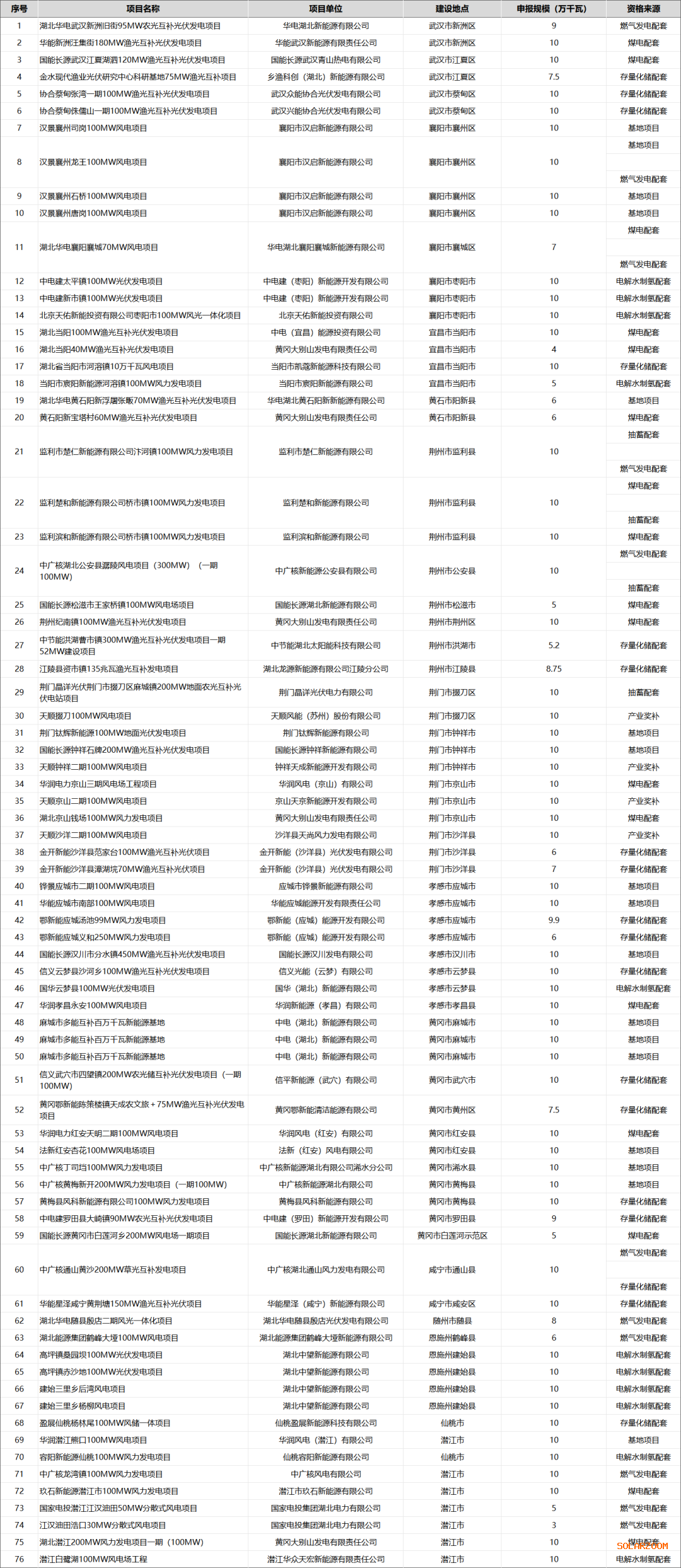 具体见下:省能源局关于参与2023年度新能源竞配项目的公示根据《省能源局关于探索开展新能源项目竞争性配置的通知》(鄂能源新能〔2023〕58号)安排,企业申请、市县推送参与竞配的新能源发电项目共有100个,总容量910.75万千瓦。为引导企业良性竞争、化解潜在风险矛盾,经局专题办公会研究确定,在鄂能源新能〔2023〕2号和鄂能源新能〔2023〕58号有关要求的基础上,进一步明确6条资格审查规则:一是明确未列入省能源局计划的自备燃煤电厂灵活性改造、未在迎峰度夏期间出力的在建燃气机组,申报配套的新能源项目不属于此次竞配支持范围。二是明确电解水制氢项目应积极稳妥、防范风险,未开工项目及尚未签订电解槽订购合同项目,暂不安排参与此次竞配。三是明确对资格条件项目与新能源项目业主单位不是同一家企业(集团)的,无股权关系不允许参与竞配,防止指标倒卖。四是明确煤电项目主体工程已开工(或承诺在规定时限内开工)但未投运的,只配套其新增调节能力1倍的新能源项目。五是明确与存量化储配套的项目,可申报规模按2号文规定与化学储能电站全容量建成时间挂钩,具体时间节点和可申报规模依据“项目单位提交并网申请的日期”计算(每逾期1个月扣减20%)。六是明确不在2号文件支持范围之内的项目,不允许参与竞配。