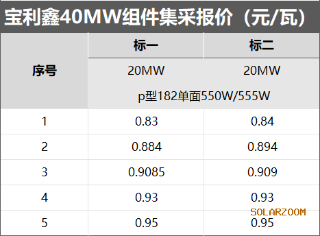 同日,宝利鑫新能源也进行了40MW p型组件的开标。集采共划分2个标段,各标段规模均为20MW,组件型号要求为182mm的p型单面550W/555W组件。