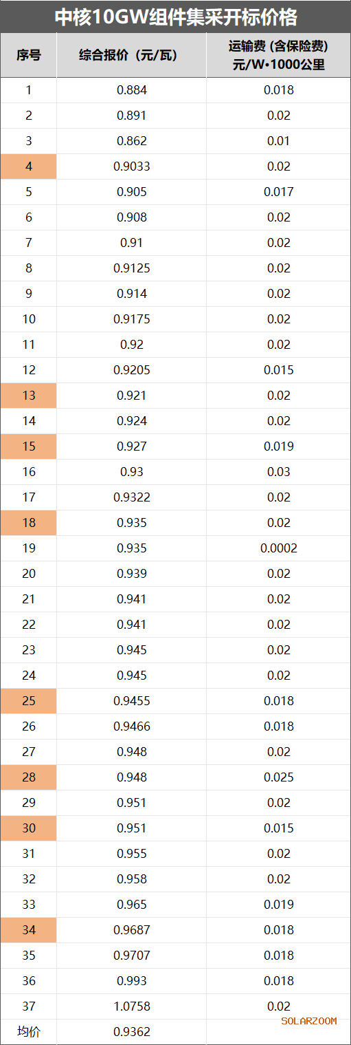 共计37家组件企业参与投标,最低报价为0.862元/瓦,具体投标则是采用了综合报价形式,且不含运费。