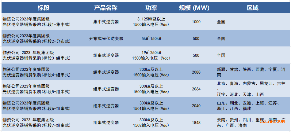 物资公司2023年度集团级光伏逆变器铺货采购招标,招标集中式、组串式逆变器,采购规模共计10GW。标段1-标段3为全国招标。