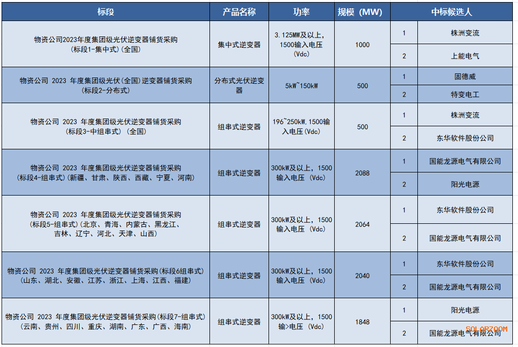 12月29日,国家能源集团物资公司2023年度集团级光伏逆变器铺货采购招标项目中标候选人公示,株洲变流、上能电气、固德威、特变电工、东华软件股份公司、国能龙源电气有限公司、阳光电源7家企业入围。