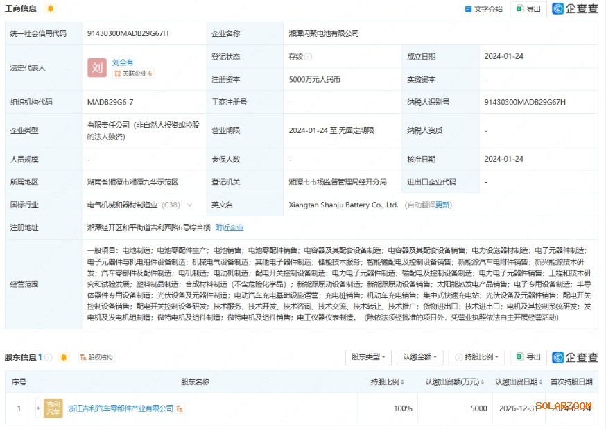 企查查App显示,近日,湘潭闪聚电池有限公司成立,法定代表人为刘全有,注册资本5000万元人民币,经营范围含电池制造、电池销售、电子元器件制造、储能技术服务、半导体器件专用设备制造、光伏设备及元器件制造等。股东信息显示,该公司由浙江吉利汽车零部件产业有限公司全资持股。