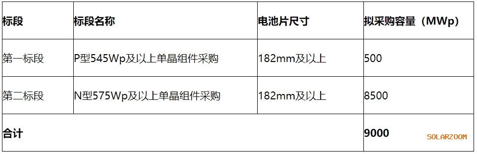 组件集采分为两个标段,分别为:P型545Wp及以上单晶组件,电池尺寸为182mm及以上,数量为500MW;N型575Wp及以上单晶组件采购,182mm及以上,8500MW。