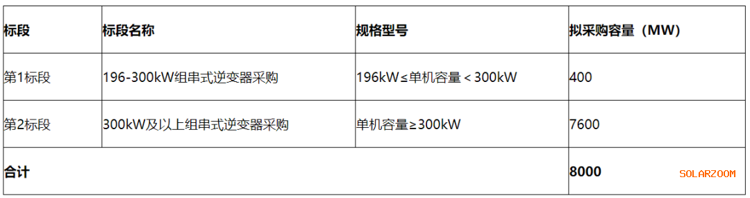 逆变器集采分为两个标段,分别为:196-300kW组串式逆变器采购,196kW≤单机容量<300kW,400MW;300kW及以上组串式逆变器采购,单机容量≥300kW,7600MW。