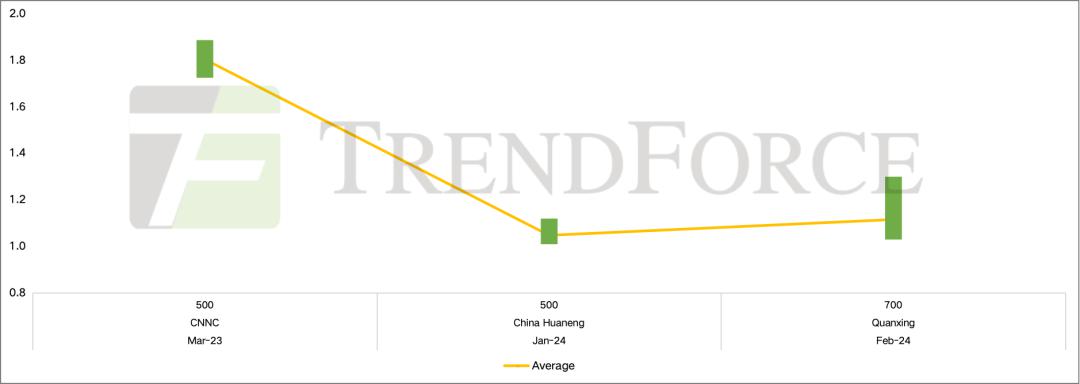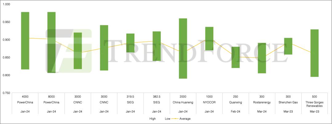 3月共有约9.3GW N型组件集采开标,投标价格在0.839元/W-1.003元/W之间,投标均价为0.887元/W,较2月均价下跌0.045元/W,且与PERC投标价差环比持续下跌。其中,3月14日,三峡集团2024年光伏组件框架集中采购 (第一批次)项目开标,N型标段报价则在0.839~1.003元/W,均价为0.907元/W,从TOP 10企业的报价节奏来看,头部企业抬价意愿相对较强。对比2月份中石油7GW组件集采的开标价格来看,多家在手订单充足的企业投出高价,N型标段的整体报价以及均价均略高于中石油此前0.903元/瓦左右的开标价格。