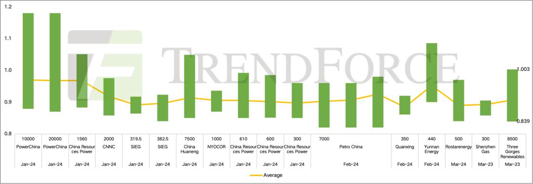 从招标业主来看,3月主要是中核集团旗下新华水力及中核(南京)共10GW光伏组件招标,其次华电集团2024年第一批9GW光伏组件集采招标;2024年Q1 Top10招标业主招标量占总体招标量的90%。