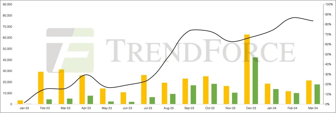据TrendForce集邦咨询中国光伏产业招投标数据库统计,2024年3月共公布了约21.37GW光伏组件招标,环比上涨85%;在经历春节假期后,企业积极开展招投标活动,叠加天气逐渐回暖,分布式及集中式项目逐步开工带动招标量稳步提升。