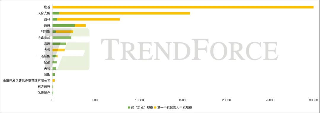 通威、协鑫、晶澳已定标规模较多,分别为2.6GW、2.16GW、1.56GW;隆基、天合、晶科第一中标候选人中标规模居多。