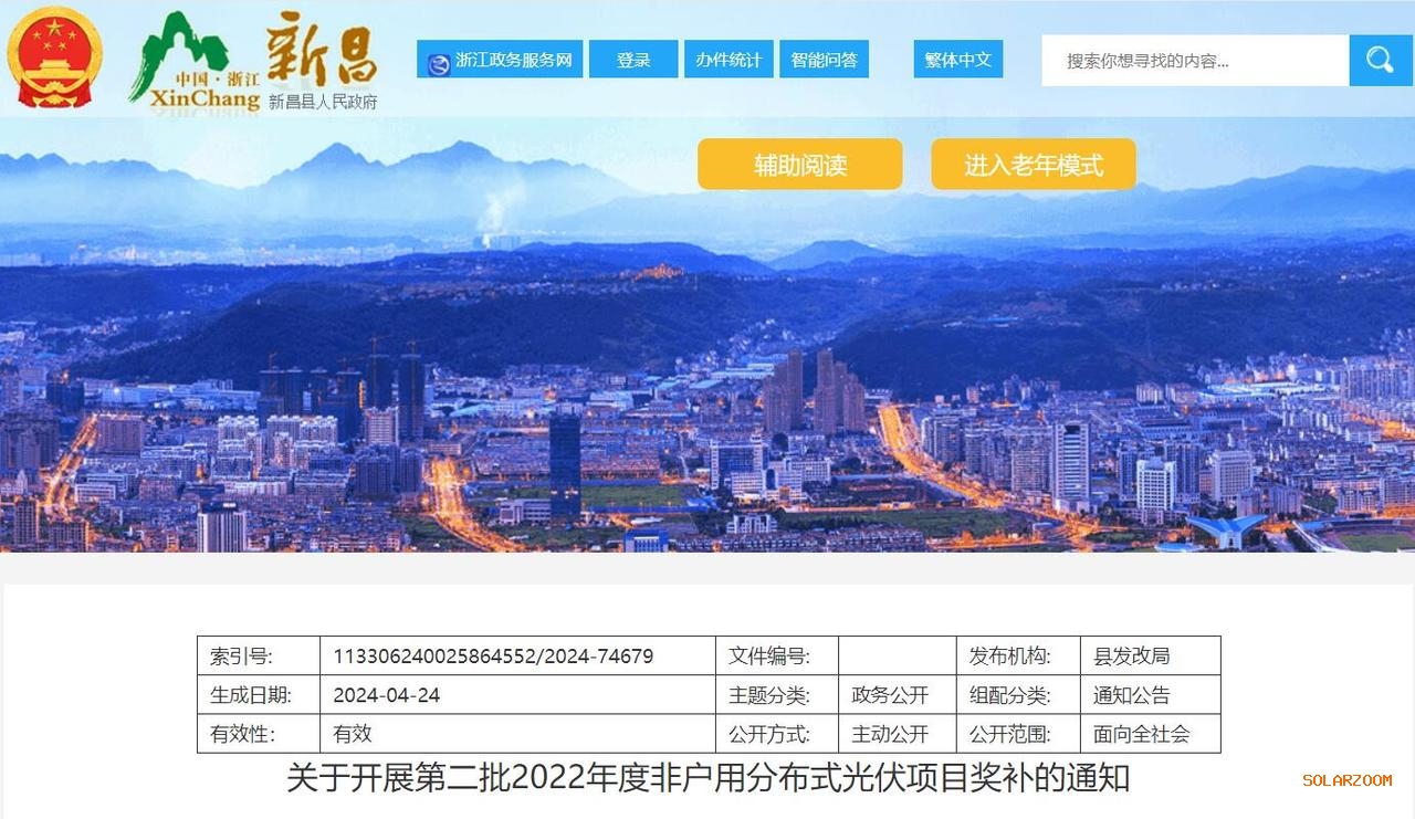 4月24日,新昌县人民政府发布关于开展第二批2022年度非户用分布式光伏项目奖补的通知,通知指出,对符合建设规范的2022年并网光伏项目,按其实际发电量给予0.2元/千瓦时的补贴,补贴期限为自发电之日起一年。
