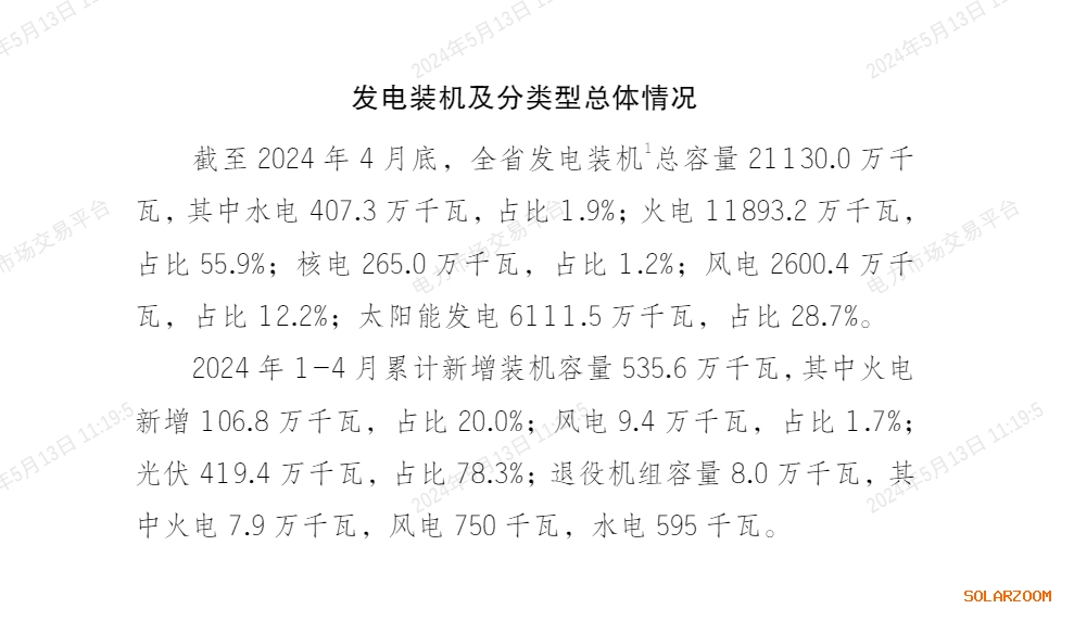 2024年1-4月累计新增装机容量535.6万千瓦,其中火电新增106.8万千瓦,占比20.0%;风电9.4万千瓦,占比1.7%;光伏419.4万千瓦,占比78.3%;退役机组容量8.0万千瓦,其中火电7.9万千瓦,风电750千瓦,水电595千瓦。