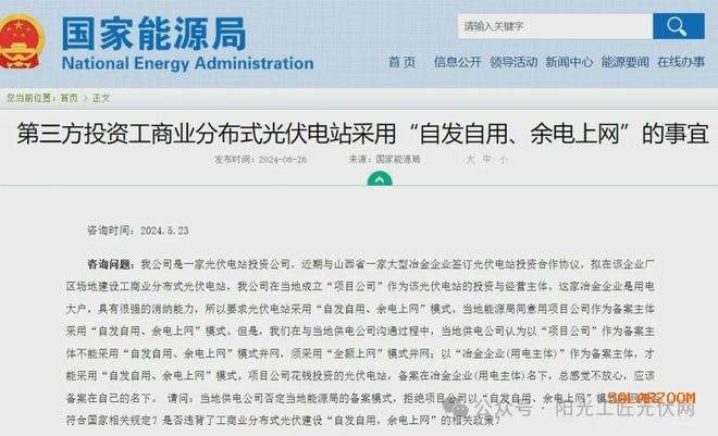 咨询问题:我公司是一家光伏电站投资公司,近期与山西省一家大型冶金企业签订光伏电站投资合作协议,拟在该企业厂区场地建设工商业分布式光伏电站,我公司在当地成立“项目公司”作为该光伏电站的投资与经营主体。这家冶金企业是用电大户,具有很强的消纳能力,所以要求光伏电站采用“自发自用、余电上网”模式。当地能源局同意用项目公司作为备案主体采用“自发自用、余电上网”模式。但是,我们在与当地供电公司沟通过程中,当地供电公司认为以“项目公司”作为备案主体不能采用“自发自用、余电上网”模式并网,须采用“全额上网”模式并网;以“冶金企业(用电主体)”作为备案主体,才能采用“自发自用、余电上网”模式。项目公司花钱投资的光伏电站,备案在冶金企业(用电主体)名下,总感觉不放心,应该备案在自己的名下。请问:当地供电公司否定当地能源局的备案模式,拒绝项目公司以“自发自用、余电上网”模式并网是否符合国家相关规定?是否违背了工商业分布式光伏建设“自发自用,余电上网”的相关政策?