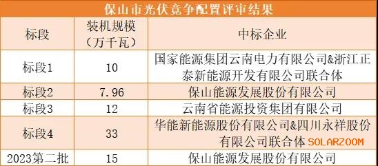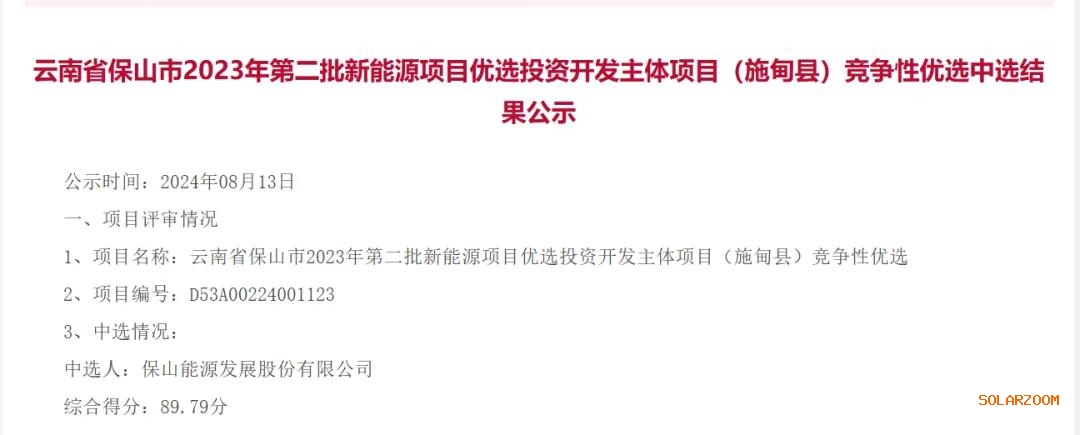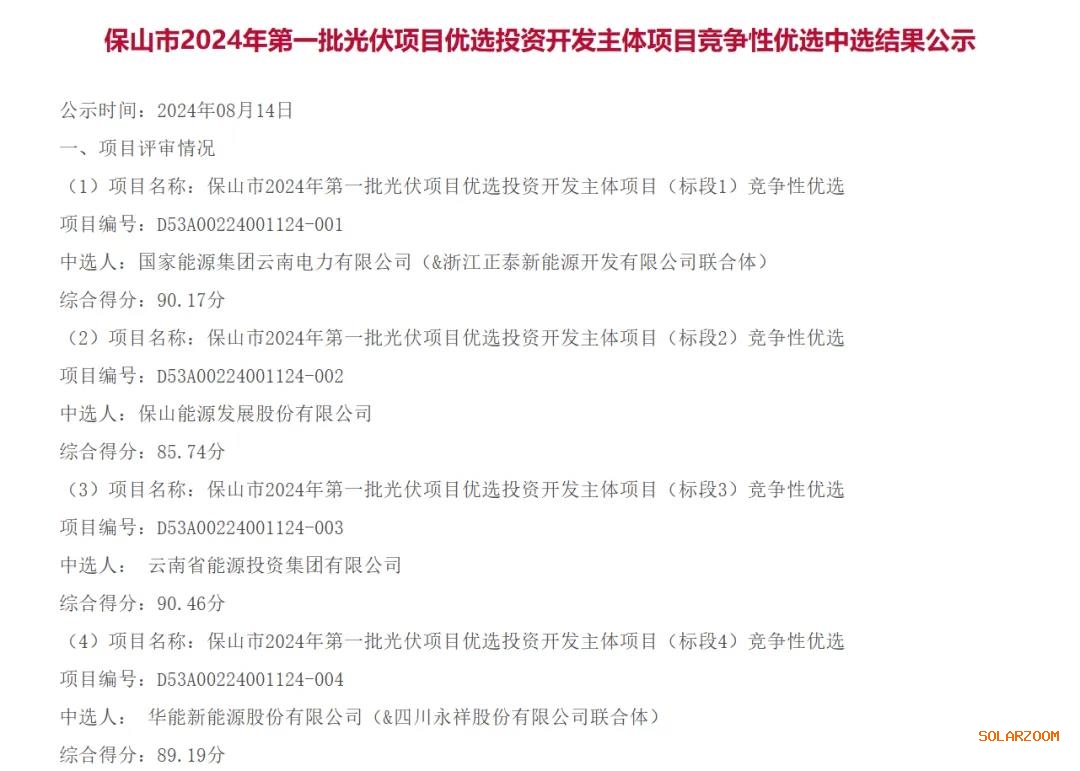 8月14日,云南保山市公示2024年第一批光伏项目优选投资开发主体项目竞争性优选中选结果,华能、云南能投、国家能源集团、保山能源等四家企业及其联合中标本次优选,规模共计629.6MW;同时,保山市2023年第二批施甸县中标结果公示,保山能源中标150MW。