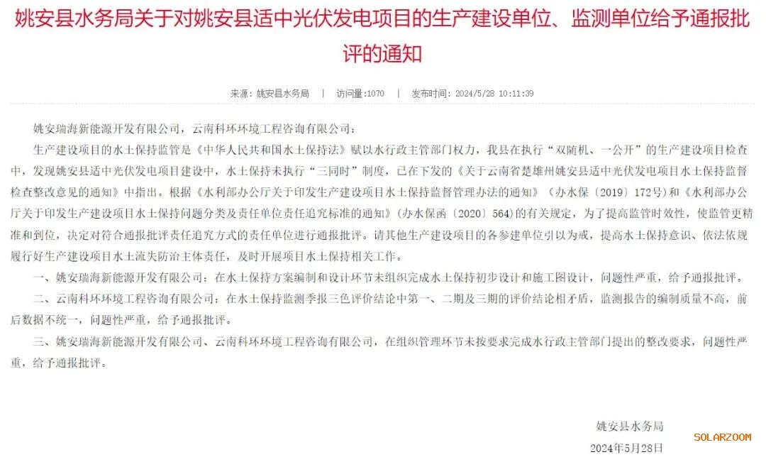 据了解,今年5月28日,云南姚安县水务局就曾发布关于对姚安县适中光伏发电项目的生产建设单位、监测单位给予通报批评的通知。通知文件指出,姚安县水务局在生产建设项目检查中,发现姚安瑞海新能源开发有限公司:在水土保持方案编制和设计环节未组织完成水土保持初步设计和施工图设计,问题性严重,给予通报批评。并且,姚安瑞海新能源开发有限公司在组织管理环节未按要求完成水行政主管部门提出的整改要求,问题性严重,给予通报批评。