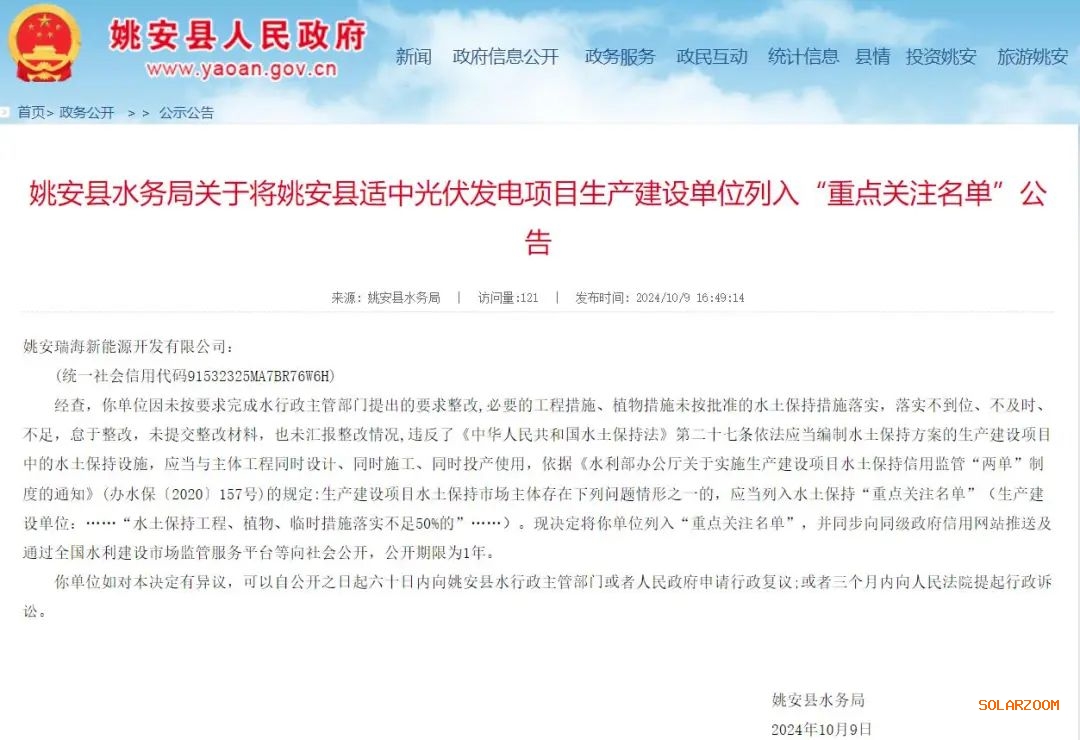10月9日,云南省楚雄州姚安县水务局发布一则公告,姚安瑞海新能源开发有限公司因未按要求完成水行政主管部门提出的要求整改,必要的工程措施、植物措施未按批准的水土保持措施落实,落实不到位、不及时、不足,怠于整改,未提交整改材料,也未汇报整改情况,被列入水土保持“重点关注名单”,并同步向同级政府信用网站推送及通过全国水利建设市场监管服务平台等向社会公开,公开期限为1年。