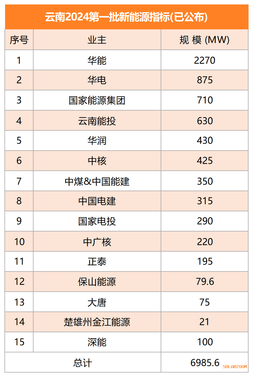 结合此前已经完成指标优选的部分市县来看,云南2024年第一批新能源指标已确定业主规模为6.99GW,华能、华电、国家能源集团、云南能投所获规模超500MW。