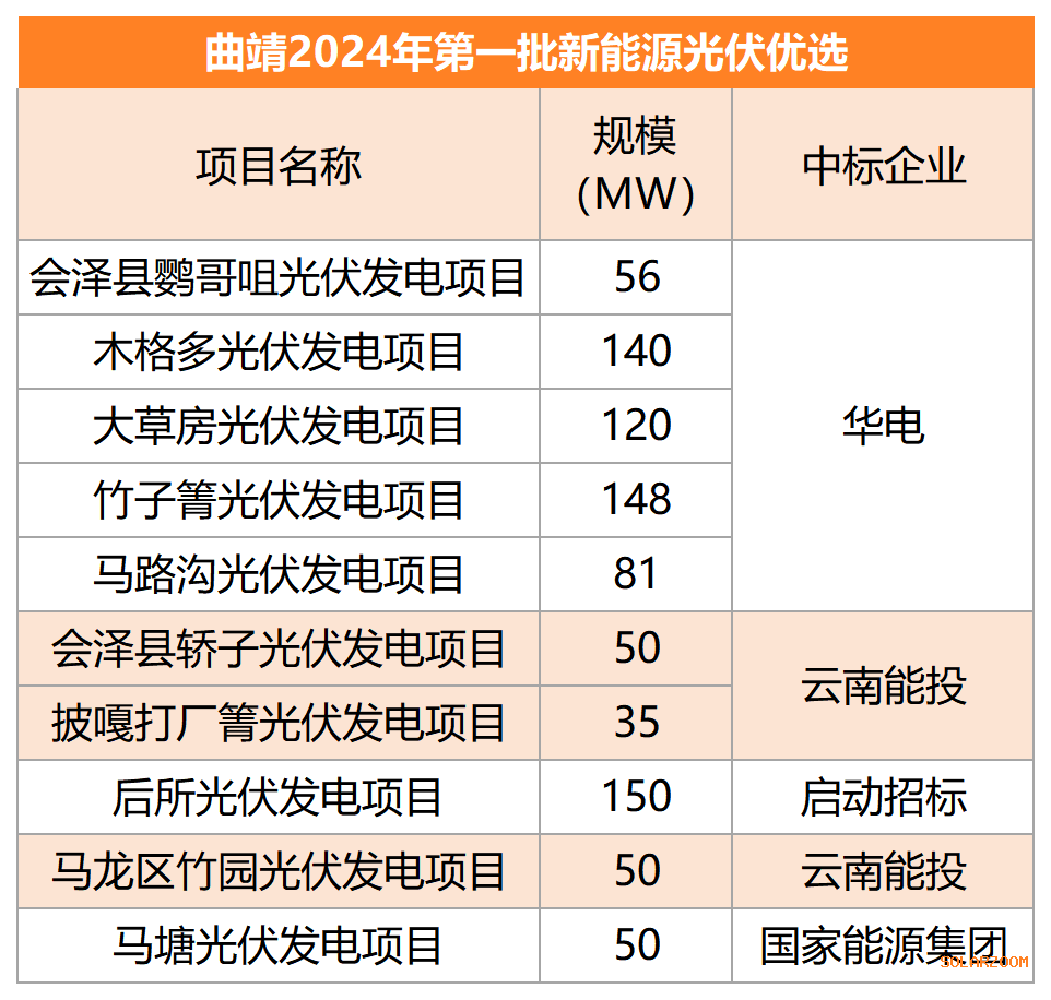 2024年,云南曲靖市第一批新能源安排的项目总规模为915MW,此前启动招标的规模共880MW,目前已中标的规模为730MW,其中华电中标545MW,云南能投中标135MW,国家能源集团中标50MW。