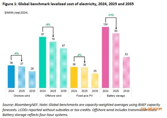 2025年2月6日,彭博全球环境基金(BNEF)重磅发布的最新报告,报告明确指出,2025年,风能、太阳能和电池技术等一系列清洁能源技术成本预计将迎来2-11%的进一步下降,这一趋势有望强势打破去年的成本纪录。