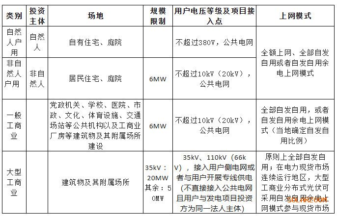 1.根据新政,分布式光伏分为自然人户用、非自然人户用、一般工商业和大型工商业四种类型。各种类型的定义、投资主体、场地、规模限制、电压等级、上网模式规定如下: