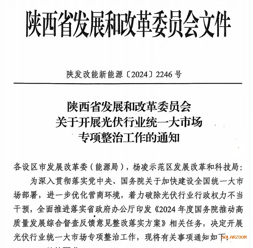日前,陕西省发改委印发《关于开展光伏行业统一大市场专项整治工作的通知》,重点整治光伏行业行政权力不当干预相关行为,促进光伏行业大规模、市场化、高质量发展。