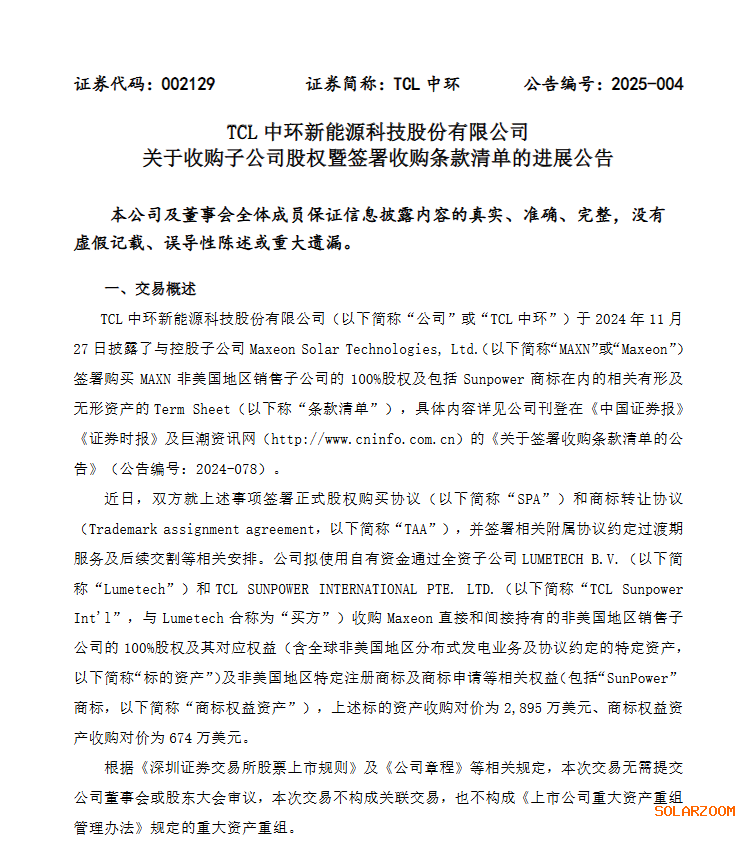 2月19日,TCL中环发布收购子公司股权进展公告。公告显示,公司拟收购Maxeon直接和间接持有的非美国地区销售子公司的100%股权及其对应权益及该地区特定注册商标及商标申请等相关权益(包括“SunPower”商标),双方就上述事项签署正式股权购买协议和商标转让协议,并签署相关附属协议约定过渡期服务及后续交割等相关安排。