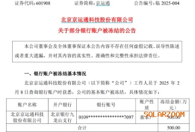 京运通(601908)发布公告称,其于近日查询银行账户时获悉,公司的基本账户被冻结,冻结金额为500万元。