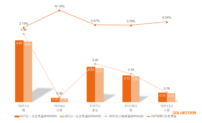 在实证过程中,我们还对不同天气条件下HJT和BC的发电量进行了对比。实证结果显示,在2024年10月至2024年12月冬季期间,在不同天气条件下,HJT组件单日发电量优于BC组件,单日日均增发最高14.18%。