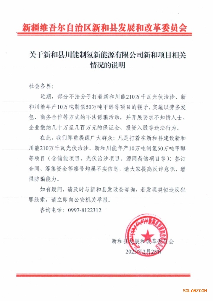 据新疆网络辟谣公众号,经与相关部门核实,凡是以“新和县川能210万千瓦光伏治沙”“年产10万吨制氢50万吨甲醇”等项目(含储能项目、光伏治沙项目、源网荷储项目等)名义签订合同、募集资金或发布融资信息的,均属不实信息。