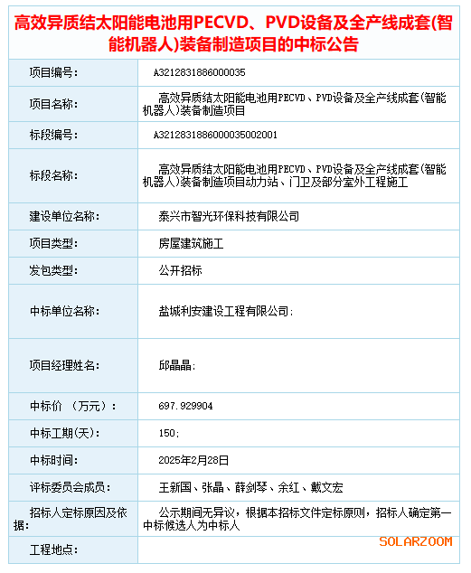 2月28日中国招标投标公共服务平台发布高效异质结太阳能电池用PECVD、PVD设备及全产线成套(智能机器人)装备制造项目的中标公告。