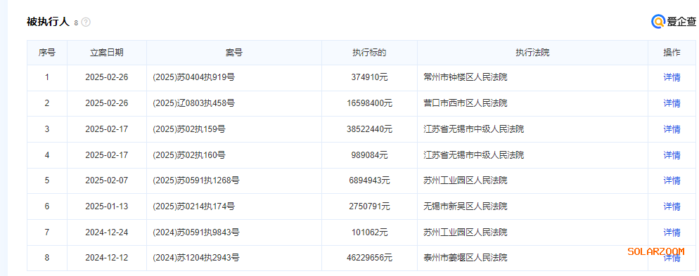 执行信息方面,2月26日1天,尚德电力新增2条执行信息,执行法院分别为常州市钟楼区人民法院和营口市西市区人民法院,执行标的各为374910元和16598400元。