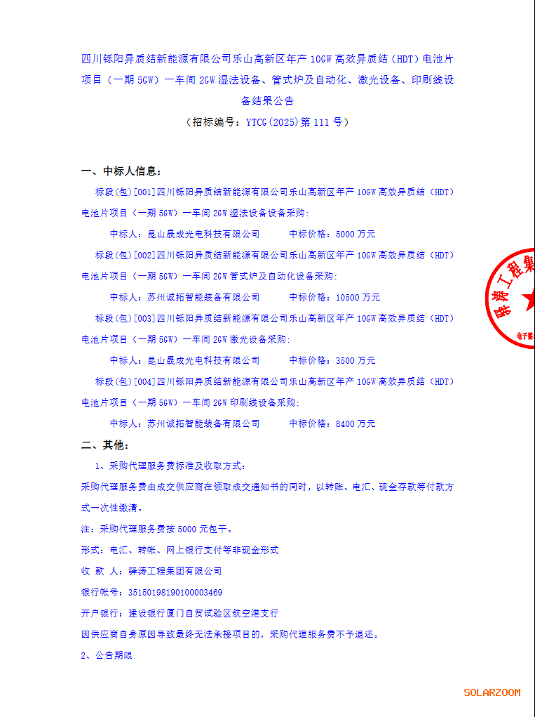 3月5日中国招标投标公共服务平台发布了四川铄阳异质结新能源有限公司乐山高新区年产 10GW 高效异质结(HDT)电池片项目(一期 5GW)一车间 2GW 湿法设备、管式炉及自动化、激光设备、印刷线设备结果公告。