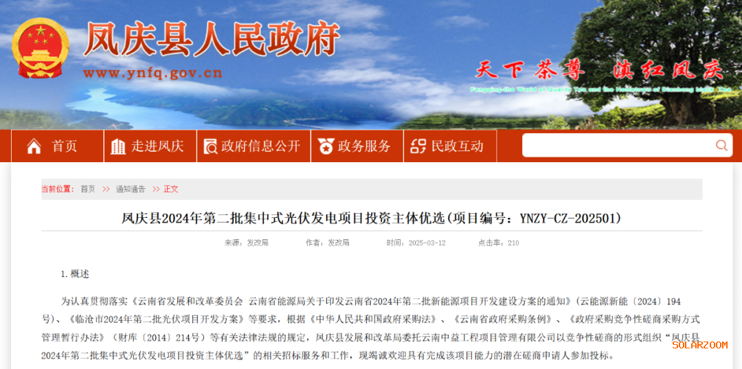 3月12日,云南凤庆县2024年第二批集中式光伏发电项目投资主体优选竞争性磋商公告发布。