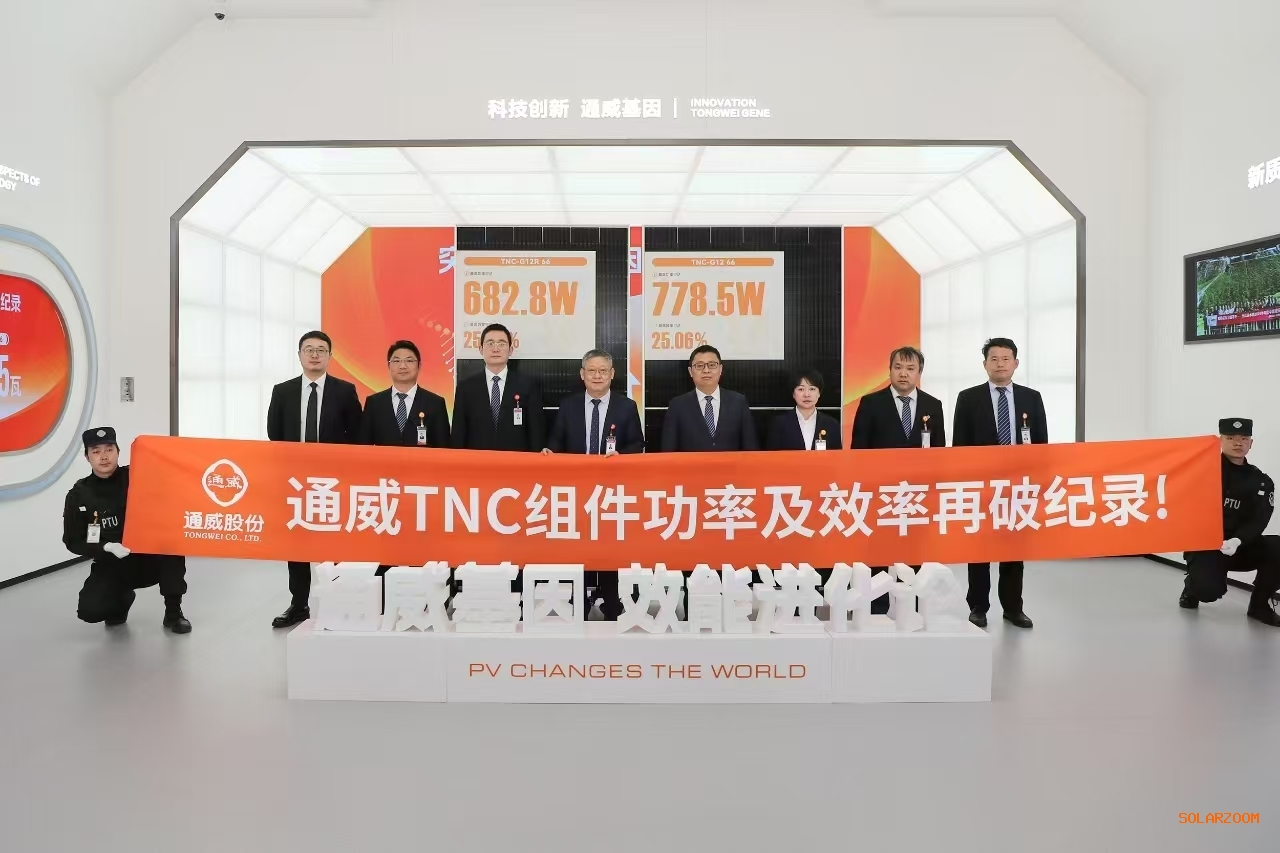 3月20日,通威股份光伏技术中心宣布,经国际权威认证机构TÜV测试,在2382*1134mm标准尺寸下,通威TNC-G12R组件正面功率达到682.8瓦(较目前市场同版型量产主流功率提高约60瓦),转换效率达25.28%;在2384*1303mm标准尺寸下,通威TNC-G12组件功率达到778.5瓦(较目前市场同版型量产主流功率提高约60瓦),转换效率达25.06%,再次刷新了TOPCon两种主流版型的组件效率和功率纪录。