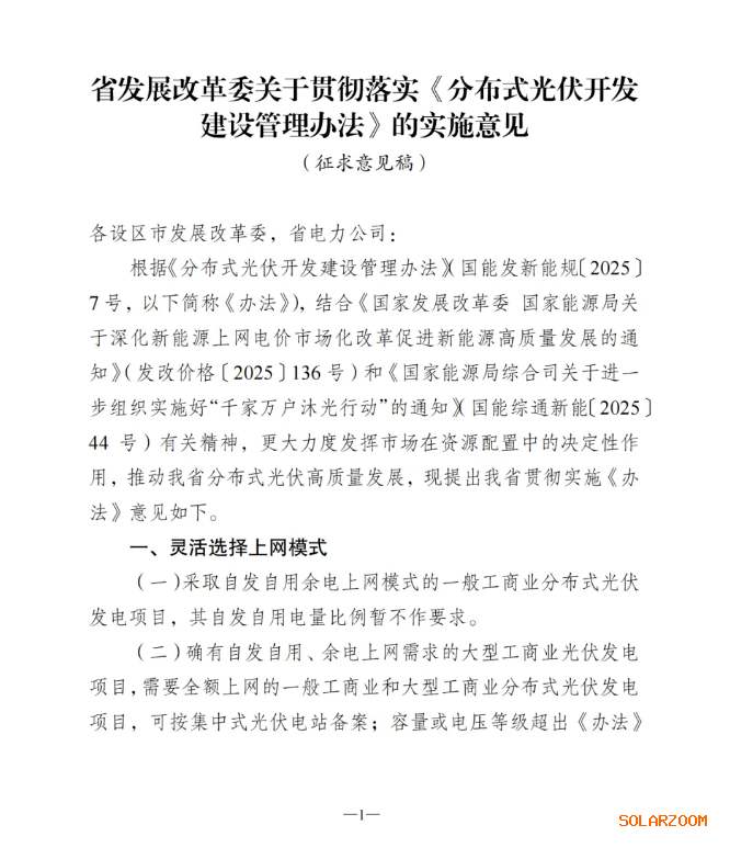 近日,江苏省发改委发布《关于贯彻落实〈分布式光伏开发建设管理办法〉的实施意见(征求意见稿)》,文件提出: