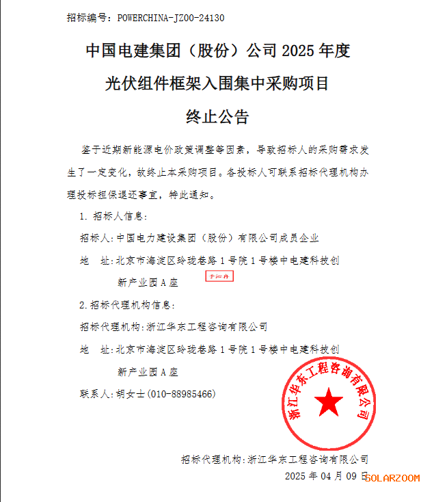 4月9日中国电建发布《中国电建集团(股份)公司2025年度光伏组件框架入围集中采购项目终止公告》。中国电建表示,鉴于近期新能源电价政策调整等因素,导致招标人的采购需求发生了一定变化,故终止本采购项目。各投标人可联系招标代理机构办理投标担保退还事宜。