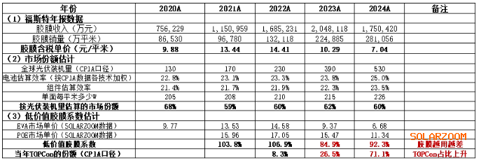图 1 福斯特所销售胶膜的“低价值系数”在TOPCon份额大幅上升的2024年反而显著上升