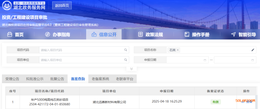 4月18日,湖北省投资项目在线审批监管平台发布了“年产5000吨高纯石英砂项目”的备案公示。