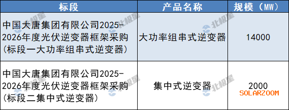 4月22日,大唐集团2025-2026年度光伏逆变器框架采购招标发布,其中大功率组串式逆变器预估采购总量14GW,集中式逆变器2GW,具体采购量以项目实际需求为准,总规模达16GW。