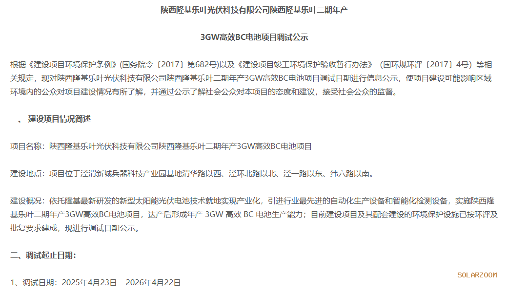 项目依托隆基最新研发的新型太阳能光伏电池技术就地实现产业化,引进行业最先进的自动化生产设备和智能化检测设备,实施陕西隆基乐叶二期年产 3GW高效BC电池项目,达产后形成年产 3GW高效BC电池生产能力;目前建设项目及其配套建设的环境保护设施已按环评及批复要求建成,现进行竣工日期公示。