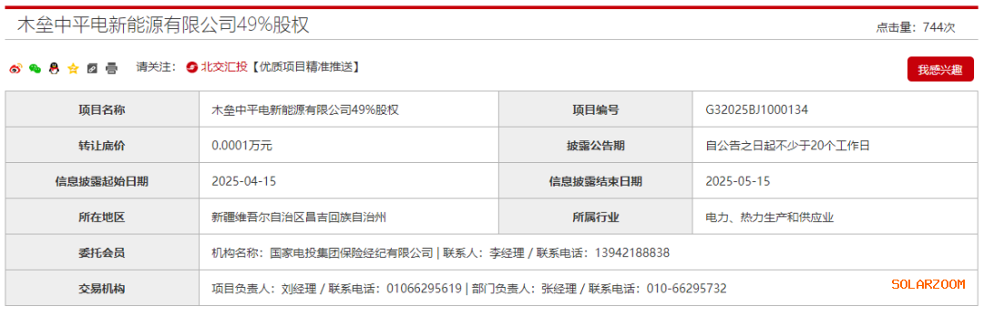 近日,北京产权交易所网站披露,国家能源集团旗下国华能源有限公司拟转让国华能源(唐山)有限公司20%股权,国家电投旗下中国电力国际发展有限公司拟转让木垒中平电新能源有限公司49%股权,转让底价均为0.0001万元。