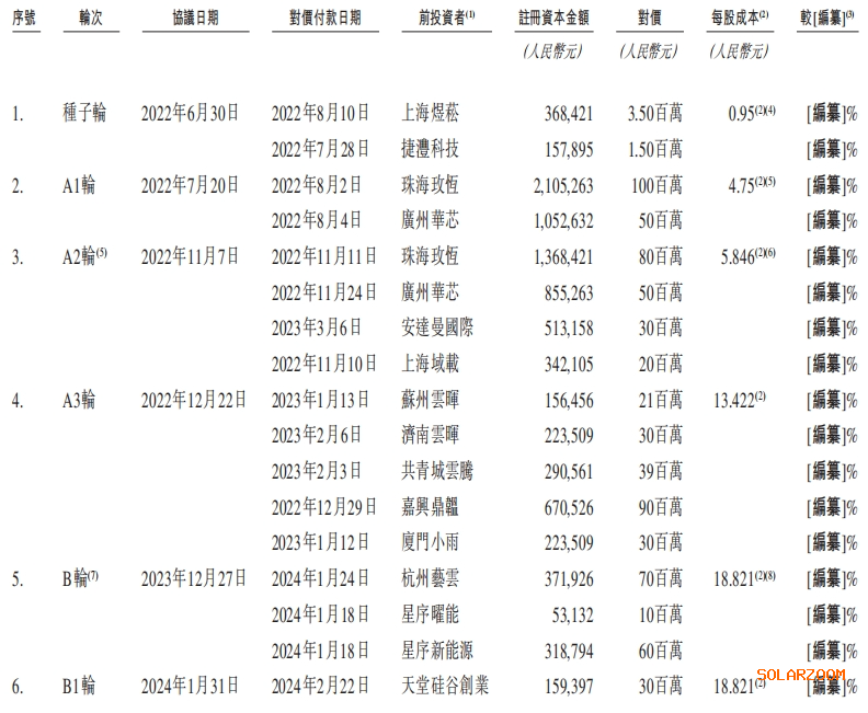 招股书显示,思格新能源先后完成6轮融资,包括2022年6月的500万元种子轮融资;2022年7月至12月进行的A1至A3轮融资,累计融资5.4亿元。2023年12月,思格新能源进行了1.4亿元B轮融资,2024年1月进行了3000万元B1轮融资。