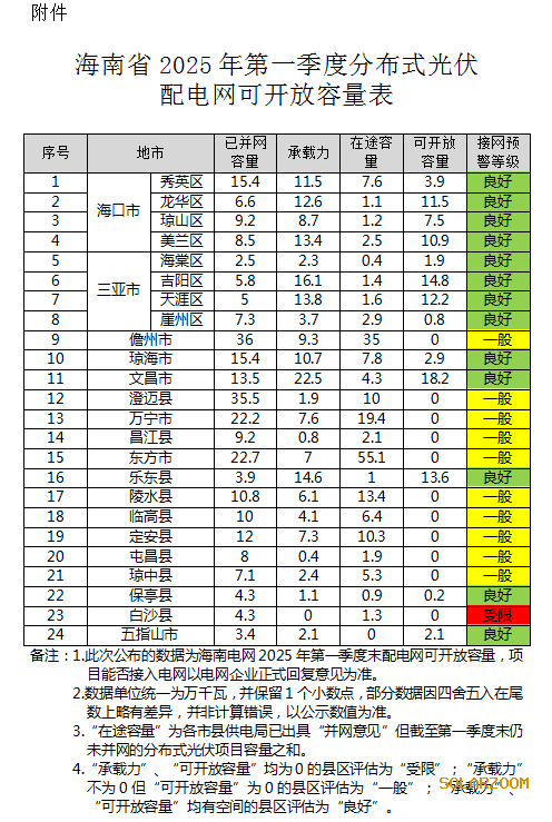 为引领我省分布式光伏发电科学合理布局,省发展改革委联合海南电网公司开展了全省分布式光伏接入电网承载能力测算和可开放容量评估工作,现将海南省2025年第一季度分布式光伏配电网可开放容量予以公布。