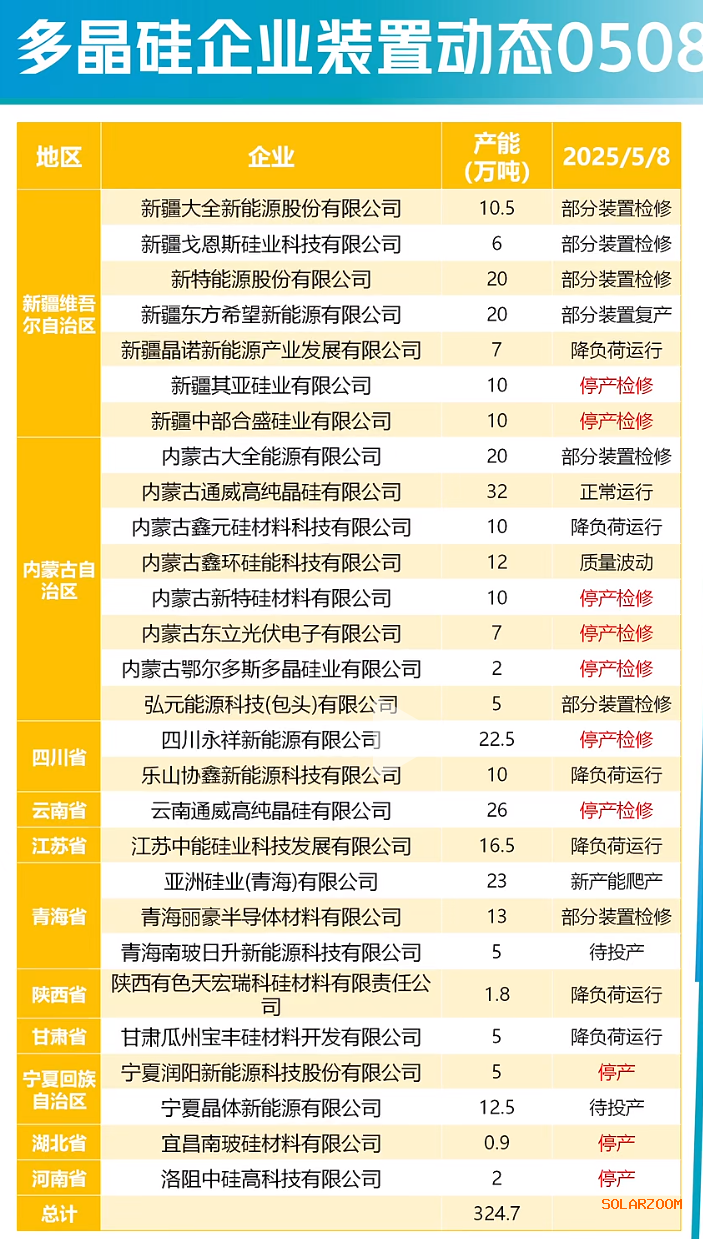 多晶硅开工、产量均维持在相对低位,同时考虑到云南、四川多晶硅产能面临较高的电价,成本压制复产,再加之行业自律背景,短期内多晶硅生产负荷提升能力有限。