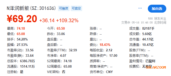 5月16日,江苏泽润新能正式登陆深交所创业板,发行价格为33.06元/股,发行市盈率为17.57倍,开盘价为65.50元/股,较发行价上涨98.12%。