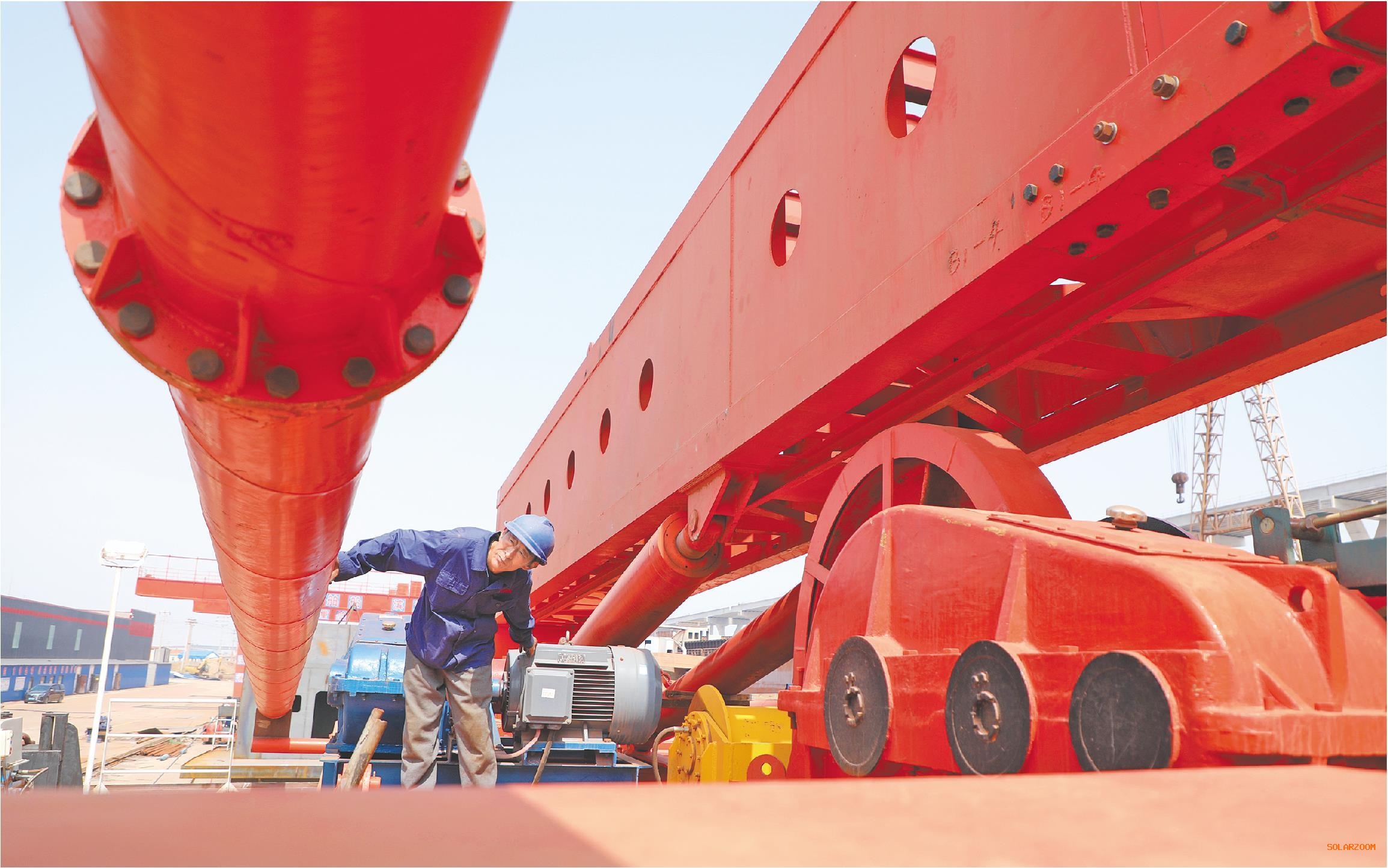 近日,在山东省无棣县东风港经济园区船舶平台上,由津滨船舶重工公司生产的海上光伏打桩船“瑞祺桩02”正在接受最后的“体检”(上图)。这艘由滨州企业自主设计建造的海上光伏打桩船已完成建造,将于6月初交付使用,标志着滨州造海上光伏打桩船成功实现升级换代。