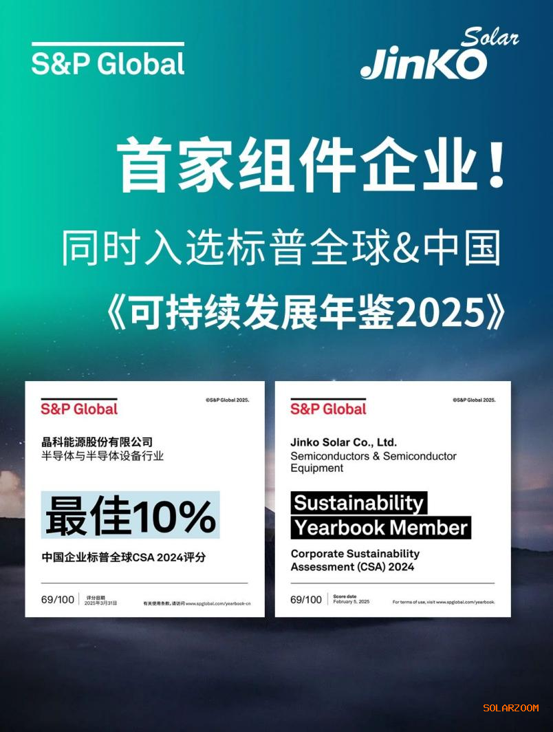 近日,晶科能源入选标普全球(S&P Global)发布的《可持续发展年鉴(中国版)2025》。在参选的1600余家中国企业中,晶科能源CSA最新评分跃升至69分,成功跻身中国企业标普全球CSA评分最佳10%的行列。此前,晶科能源已荣登全球《可持续发展年鉴2025》,成为首家同时入选标普全球和中国版年鉴的光伏组件企业,彰显了晶科能源在全球可持续发展领域的卓越实力和领先地位。