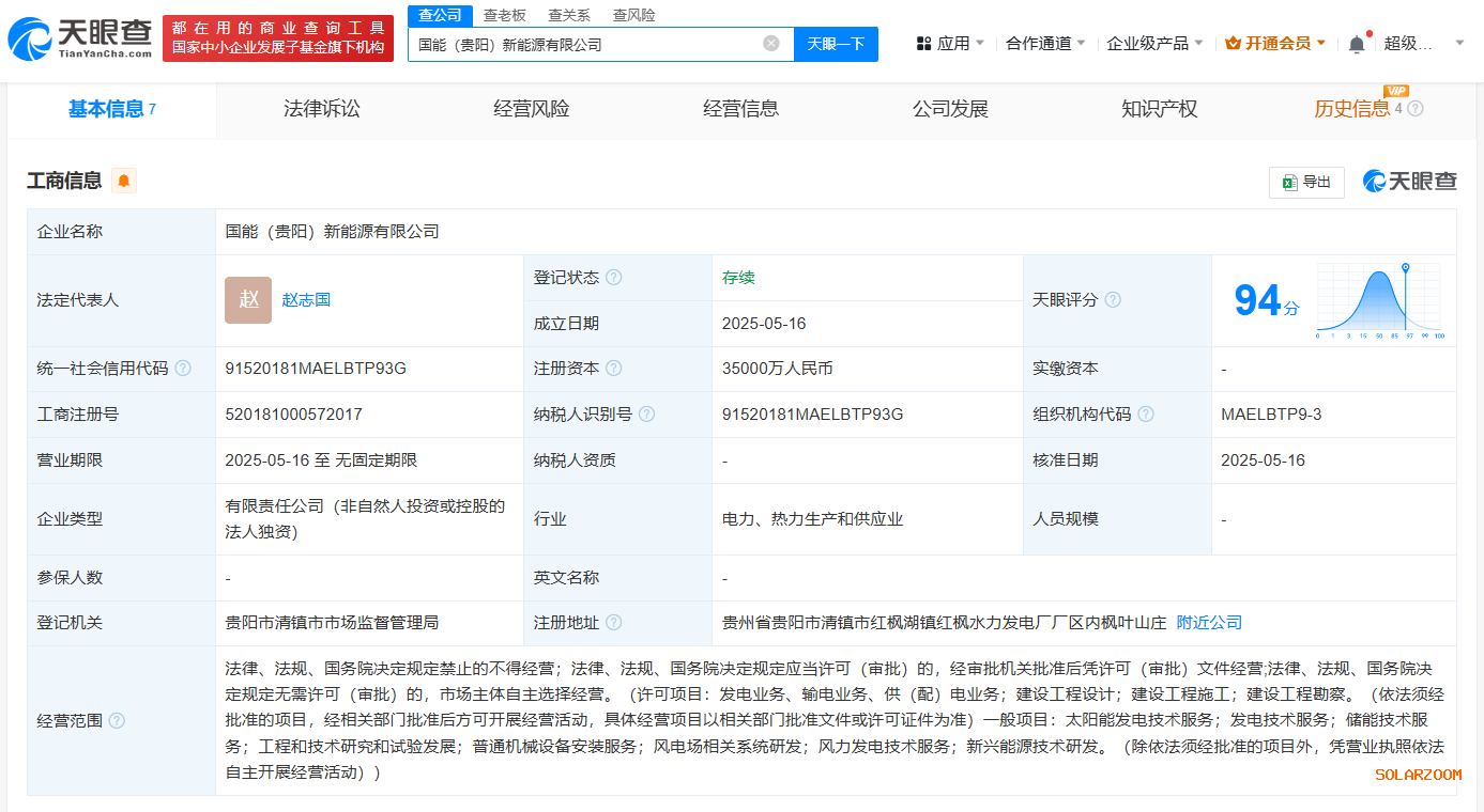 天眼查App显示,近日,国能(贵阳)新能源有限公司成立,法定代表人为赵志国,注册资本3.5亿元人民币,经营范围包括太阳能发电技术服务、发电技术服务、储能技术服务、新兴能源技术研发等。股东信息显示,该公司由国家能源集团贵州电力有限公司全资持股。
