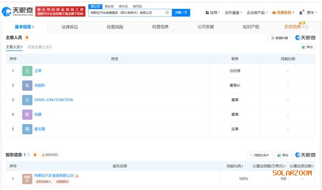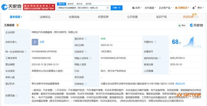 天眼查App显示,近日,特斯拉汽车销售服务(鄂尔多斯市)有限公司成立,法定代表人、总经理为王昊,董事长为朱晓彤,注册资本100万美元,经营范围包括汽车销售、二手车经纪、汽车零配件批发、汽车零配件零售、机动车修理和维护、光伏设备及元器件销售等,由特斯拉汽车香港有限公司全资持股。